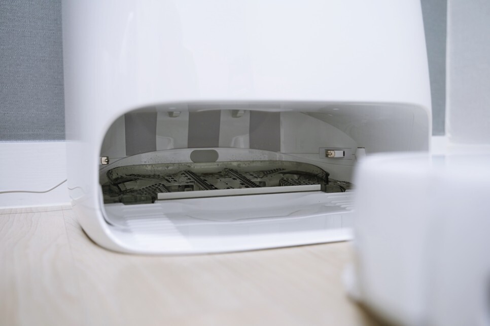 스테이션 내부에는 2개의 물통이 보이는데요. 하나는 깨끗한 물을 담아 놓는 물통이고, 나머지 한 개는 물걸레 세척할 때 사용된 오수를 담아 놓는 물통입니다. 안내 메시지로 구분이 되어 있으니 사용하는데 참고하시면 됩니다.
